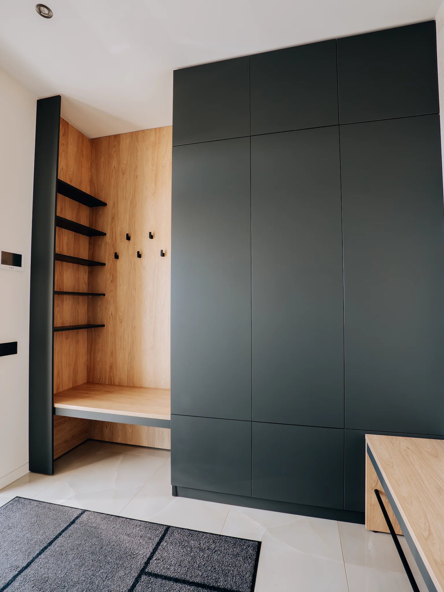 Ready-to-install wardrobe system designed specifically for hallways, featuring hanging rails for clothes, built-in storage compartments, and an integrated seating area. The package also includes a separate bench with dedicated shoe storage space underneath.